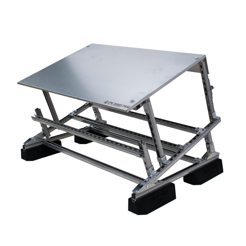 Deze uitvoering is een op zichzelf staande shelter en kan los op een dak worden geplaatst. Ideaal voor het monteren van een PVbox, combiner box of AC-werkschakelaar zonder omvormer. -